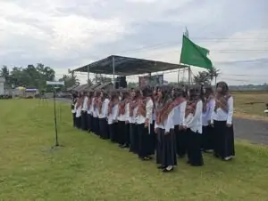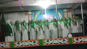 Acara pengajian semakin semarak dengan penampilan grup koor dari Fatayat NU Desa Ciwuni yang membawakan lagu Indonesia Raya, Yalal Wathon, dan Mars Banser dengan penuh semangat.